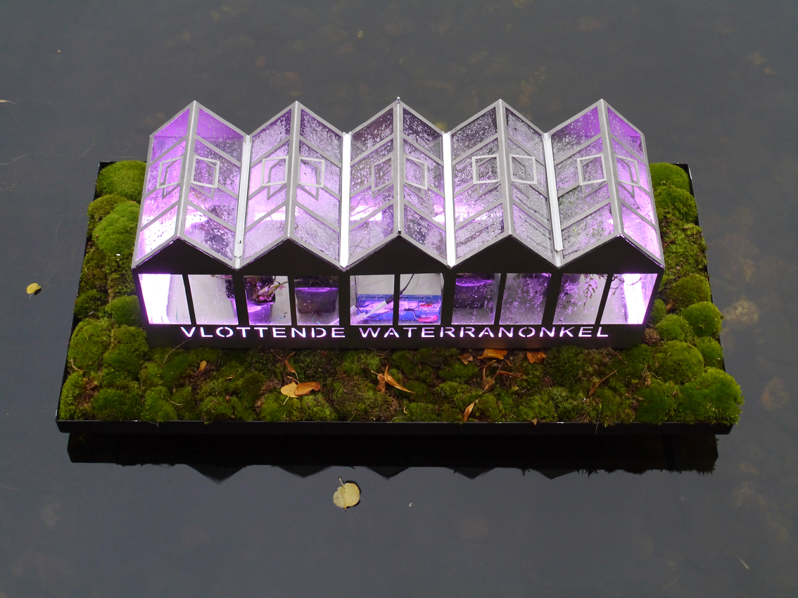 Biënnale Gelderland 2019. GTT, Beekkas 1, 2019, Action, Jansbeek Arnhem, staal, plexiglas, LED-verlichting, planten. Elke avond moet er iemand met lieslaarzen de Arnhemse Sint Jansbeek in. Gisteravond heb ik zelf, vlak voor het echt donker werd, het licht in alle 3 de beekkassen in de beek ‘ultramarijn’ gekleurd. Deze diepblauwe kleur van de nachtelijke hemel koos ik uit voor Henk. Het vlietende water in de Arnhemse binnenstad heeft deze nacht, net als ik, steeds aan Henk gedacht. Tot en met a.s. maandag 28 oktober zullen de beekkassen nachtblauw kleuren. Voor Henk, beminde vriend, gedreven kunstenaar. website Henk Visser
